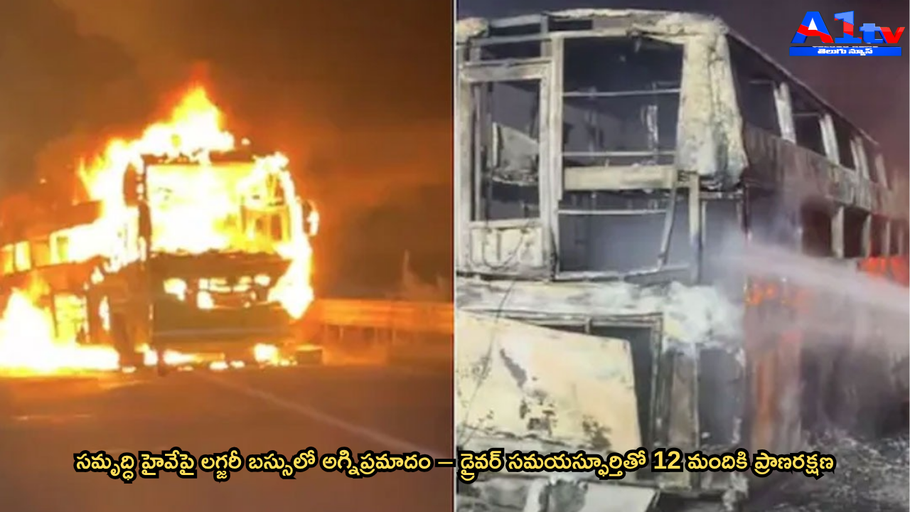 మహారాష్ట్రలోని సమృద్ధి హైవేపై గురువారం తెల్లవారుజామున జరిగిన అగ్నిప్రమాదం పెద్ద విషాదం తప్పించుకుంది. ముంబై నుండి జాల్నాకు బయలుదేరిన ఒక ప్రైవేట్ లగ్జరీ బస్సులో అకస్మాత్తుగా మంటలు చెలరేగి బస్సు పూర్తిగా దగ్ధమైంది. అయితే డ్రైవర్ సమయస్ఫూర్తితో వ్యవహరించడం వల్ల 12 మంది ప్రయాణికుల ప్రాణాలు కాపాడబడ్డాయి.