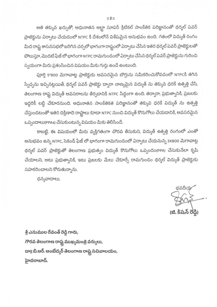 తెలంగాణ రాష్ట్రంలో నానాటికీ పెరుగుతున్న విద్యుత్ డిమాండ్ను దృష్టిలో ఉంచుకుని, రామగుండం ఎన్టీపీసీ (NTPC) రెండో దశ ప్రాజెక్టును వేగవంతం చేయాలని కోరుతూ కేంద్ర మంత్రి కిషన్ రెడ్డి ముఖ్యమంత్రి ఎ. రేవంత్ రెడ్డికి లేఖ రాశారు. ఈ ప్రాజెక్టుకు సంబంధించిన విద్యుత్ కొనుగోలు ఒప్పందాన్ని (PPA) త్వరితగతిన పూర్తి చేయాలని ఆయన ఆ లేఖలో కోరారు. సెకండ్ ఫేజ్లో భాగంగా 3X800 మెగావాట్ల సామర్థ్యంతో మొత్తం 2,400 మెగావాట్ల విద్యుత్ ఉత్పత్తికి ఎన్టీపీసీ ఇప్పటికే చర్యలు చేపట్టిందని కేంద్ర మంత్రి తెలిపారు. మొదటి దశ తరహాలోనే, ఈ రెండో దశ ప్రాజెక్టులో ఉత్పత్తి అయ్యే విద్యుత్లో సైతం 85 శాతం తెలంగాణకే సరఫరా కానుందని ఆయన స్పష్టం చేశారు. అధునాతన అల్ట్రా సూపర్ క్రిటికల్ సాంకేతికతతో నిర్మించనున్న ఈ ప్రాజెక్టు ద్వారా, తక్కువ ఖర్చుతోనే నాణ్యమైన విద్యుత్ రాష్ట్రానికి అందుబాటులోకి వస్తుందని కిషన్ రెడ్డి పేర్కొన్నారు.