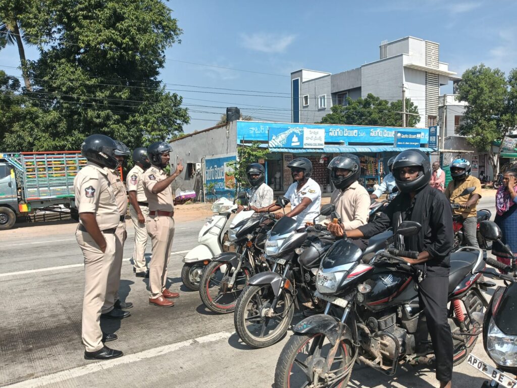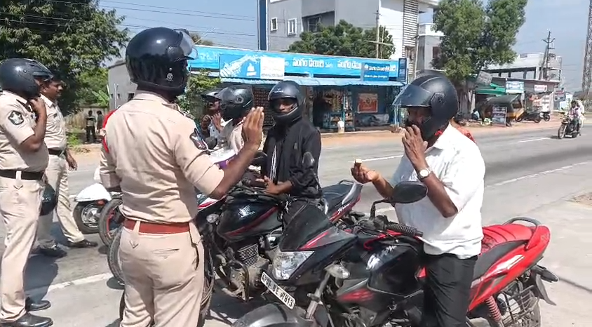Karlapalem police offering sweets to helmet-wearing riders during road safety drive Karlapalem police offering sweets to helmet-wearing riders during road safety drive