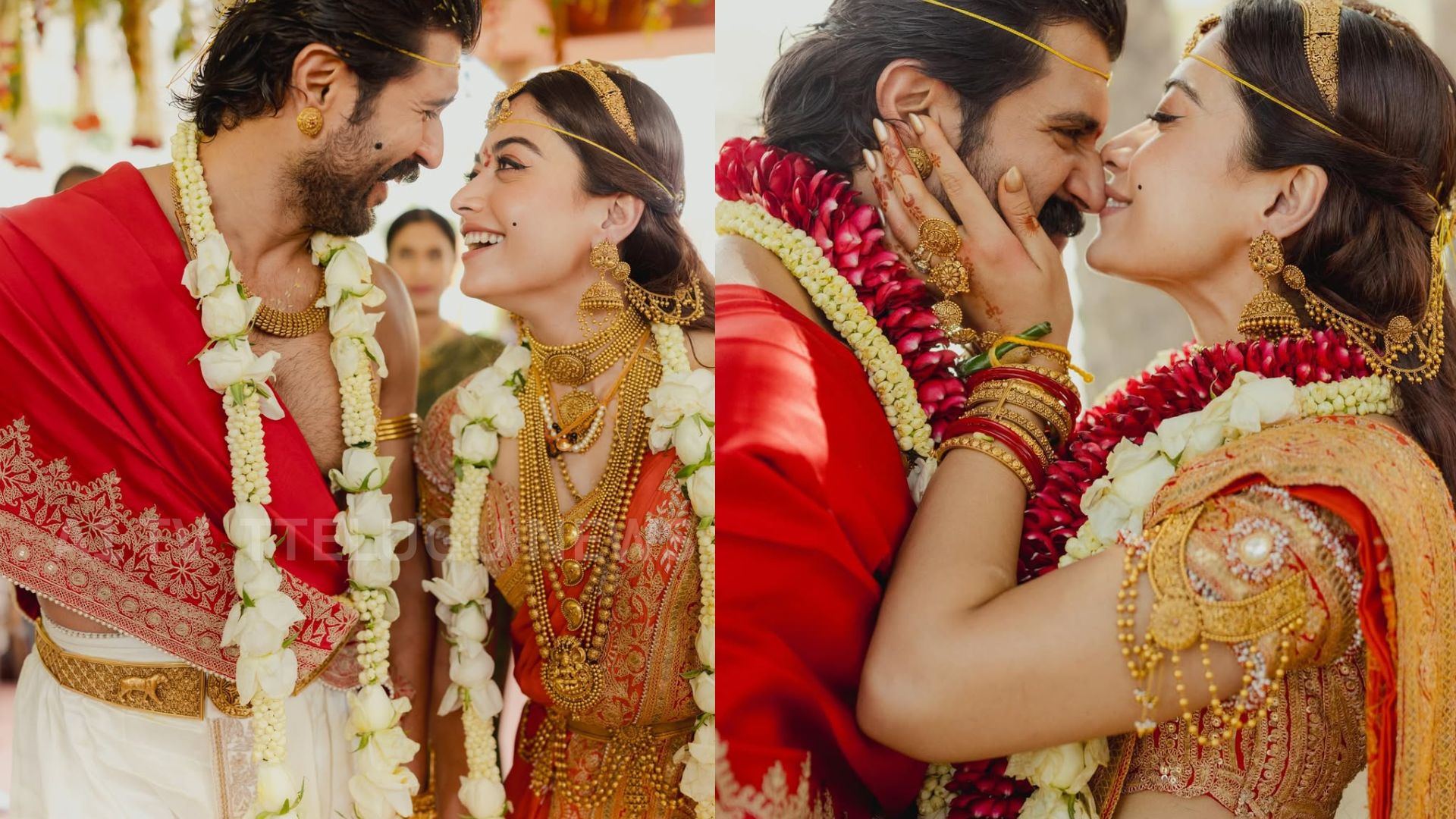 వధువు రష్మిక దక్షిణ భారత శిల్పకళ స్ఫూర్తితో రూపొందించిన 11 ఆభరణాలు ధరించారు. చోకర్, జుమ్కాలు, జడాబిల్ల, మాథాపట్టి, వడ్డాణం, పాదసరాలు యాంటిక్ మ్యాట్ ఫినిష్లో మెరిశాయి.